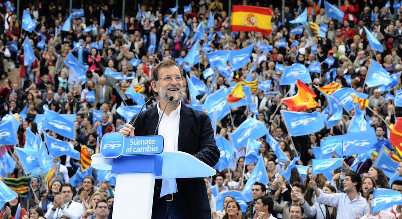 «Españoles, España ya se sale de la crisis, pero queda mucho trabajo para dejarla atrás definitivamente. ¡Plas plas plas! (Aplausos y vítores) Las crisis siempre son oportunidades para los que quieren emprender y vamos a salir fortalecidos de esta. ¡Plas plas plas! (Más aplausos y vítores) El mundo está ahí para comérselo. Vamos a construir el futuro todos juntos de la mano, y aquí no ha pasado na. ¡Plas plas plas! (Banderitas azules al viento, aplausos y vítores.) Presidente. Presidente. eeeeoeee