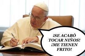 El Papa Francisco sigue con su cruzada para limpiar la iglesia católica. Esta vez, ha comentado que como la curia no hace caso a sus ruegos de que “los niños no se tocan”, ha firmado una orden de alejamiento a nivel mundial para que sus representantes no puedan acercarse a menos de 50 metros de ninguna persona menor de 15 años. Con esta medida quiere acabar con las tentaciones que tanto daño han hecho a las instituciones regidas por los representantes de dios en la tierra.
