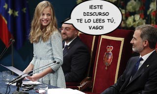 “¡Estoy harta de que me hagan trabajar siendo una niña! ¡Yo quiero irme de botellón con mis amigas y no me dejan! ¡No me van a explotar más!”. Se ha quejado Leonor tras su última entrega de premios “Princesa de Asturias”. “Tengo la muñeca dislocada de dar la mano a señores mayores, que es un trabajo que tendría que hacer mi padre, pero claro, como es Rey, no le gusta trabajar. Y me tienen hasta el coño de leer discursos que no he escrito yo”.
